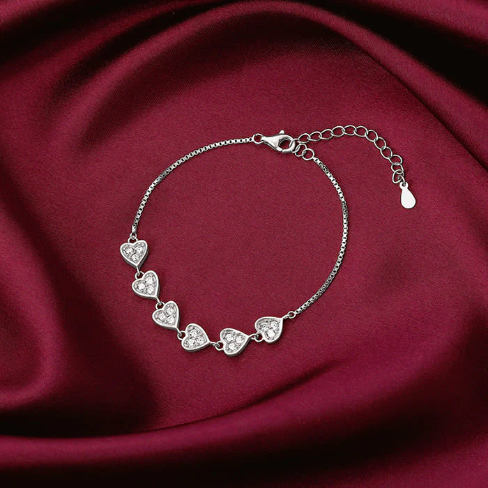 Celebrate love in its most elegant form with this stunning heart charm bracelet crafted from genuine 92.5% sterling silver. Featuring a series of dainty heart-shaped charms, each delicately set with sparkling cubic zirconia stones, this bracelet radiates grace and romance.