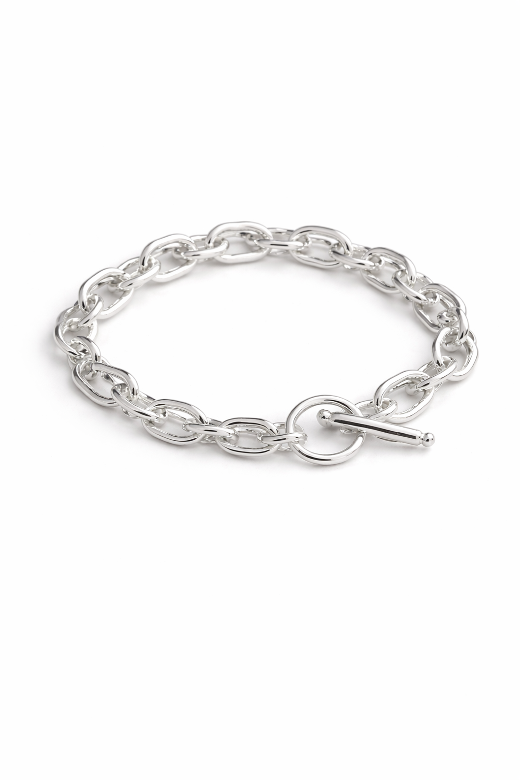 A sleek and modern silver chain bracelet featuring bold interlocking links and a signature toggle clasp. The Orbit Toggle Bracelet blends minimal elegance with everyday versatility, making it a perfect statement piece for any occasion.